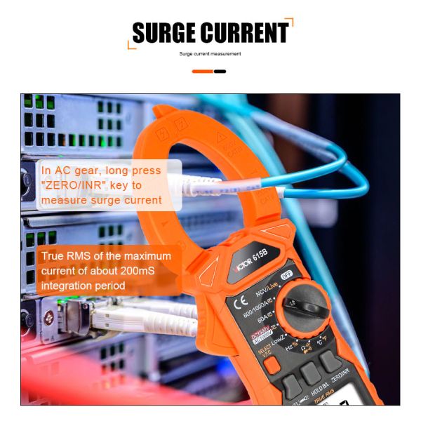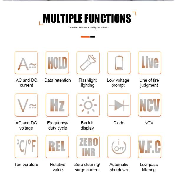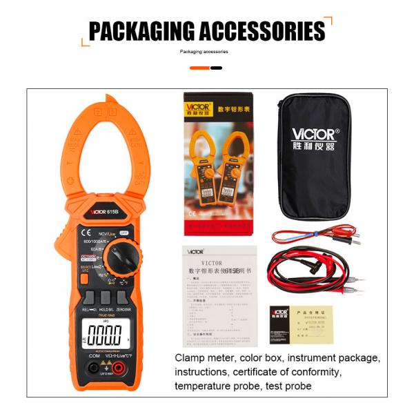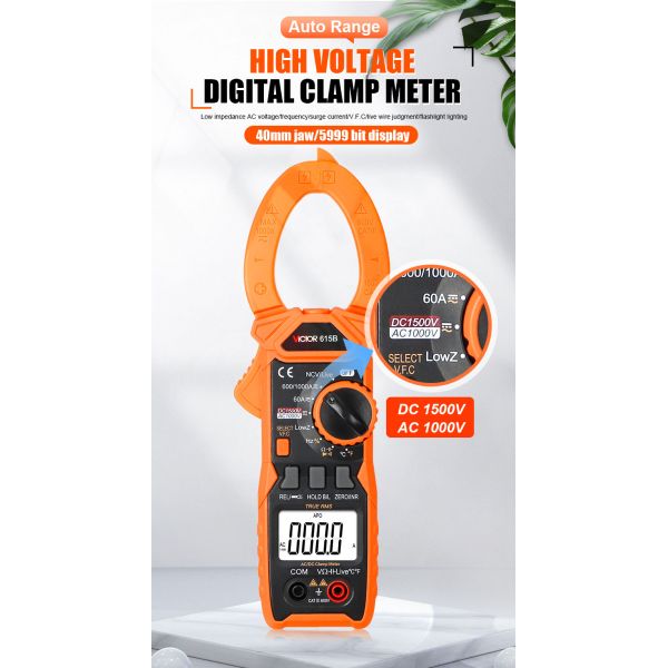 This instrument is a 6000 counts hand-held automatic range True RMS clamp digital meter. The circuit design of the meter takes the large-scale integrated circuit ∑/△ analog-to-digital converter (ADC) as the core, and it has the full-range overload protection circuit. It can be used to measure AC and DC voltage, low-pass filter VFC voltage, low impedance Low Z voltage, AC and DC current, resistance, diode, continuity test , capacitance, frequency, duty cycle, temperature and other parameters, and has data retention, relative value measurement, surge current measurement function, torch function, NCV function, live wire judgment, under-voltage display and automatic shutdown function.